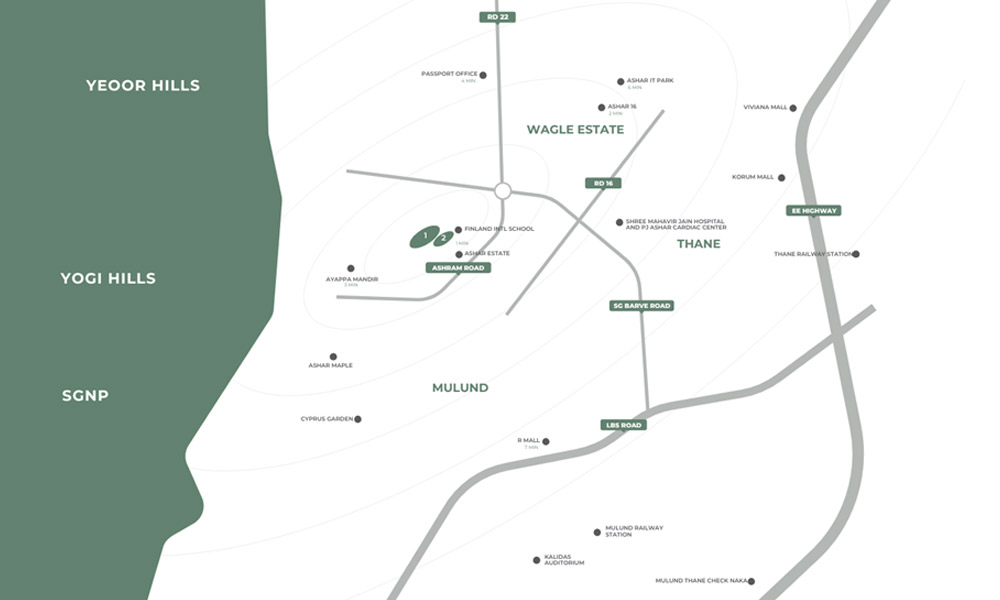 Ashar Merac is Nestled in the Mulund Thane Corridor (MTC), locally known as Shree Nagar. This area is a 5 km untouched expanse in Eastern MMR, set against the captivating backdrop of the Yogi hills. It is strategically positioned amidst the lush greenery of SGNP, the potential of Wagle Estate, the culture of Mulund and the City of Lakes, Thane. Early settlers and businesses that seize the opportunity to move into the Merac stand to gain significantly.